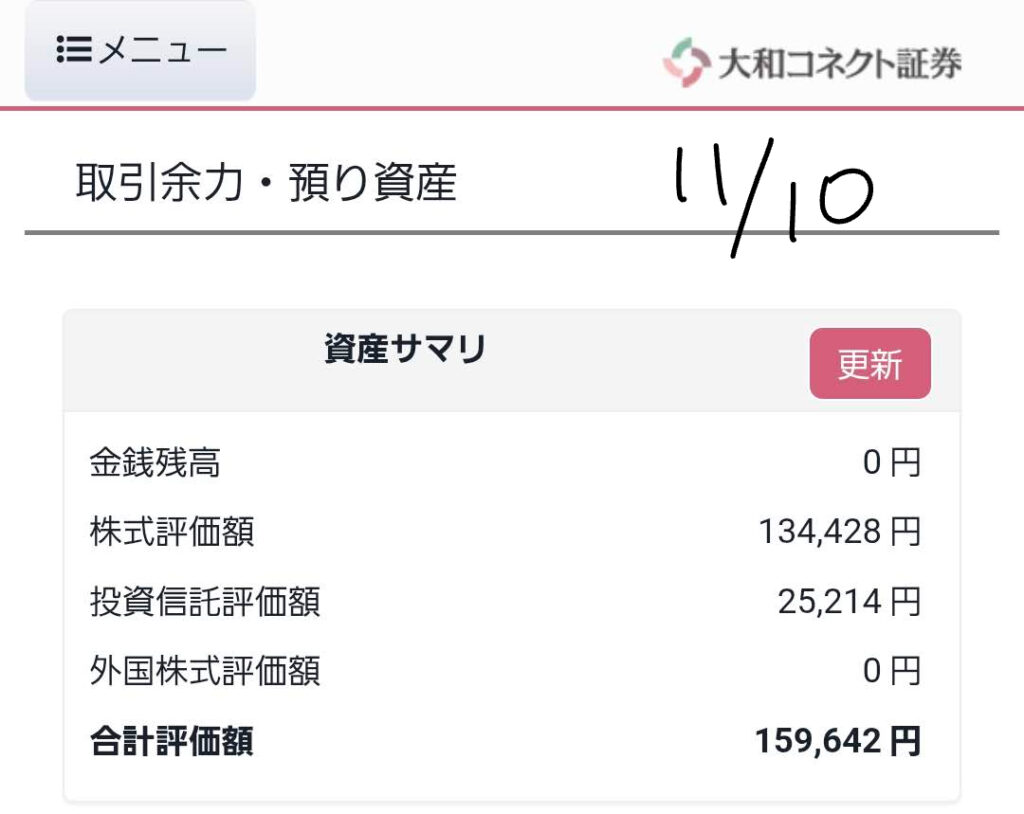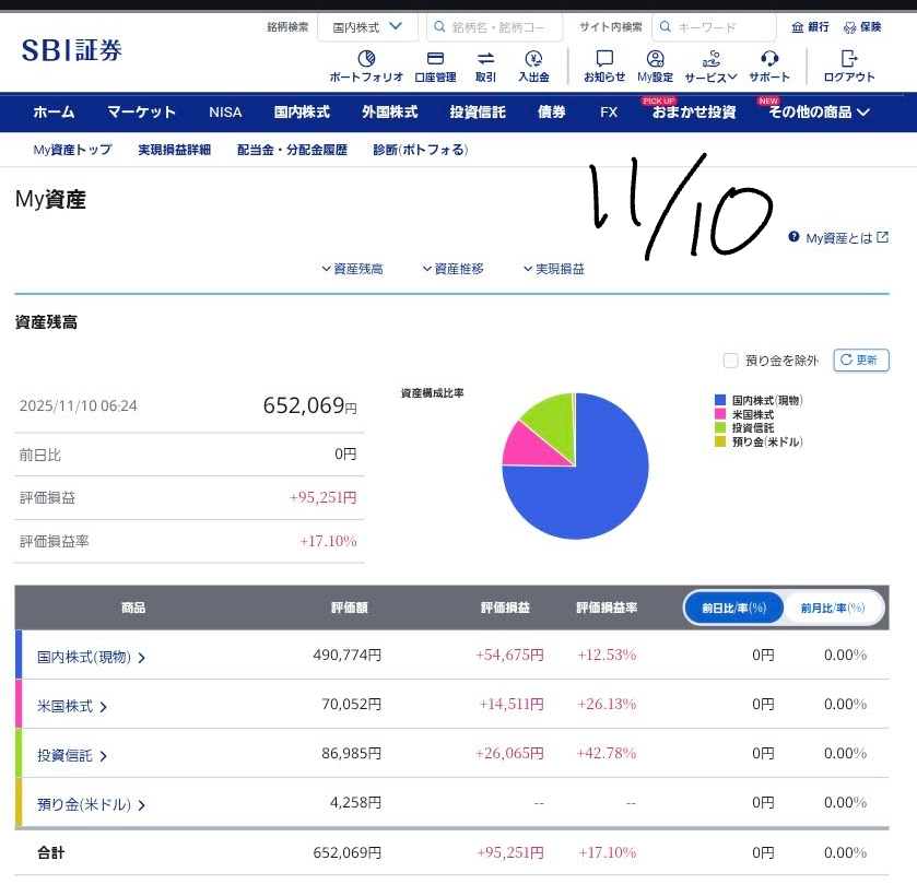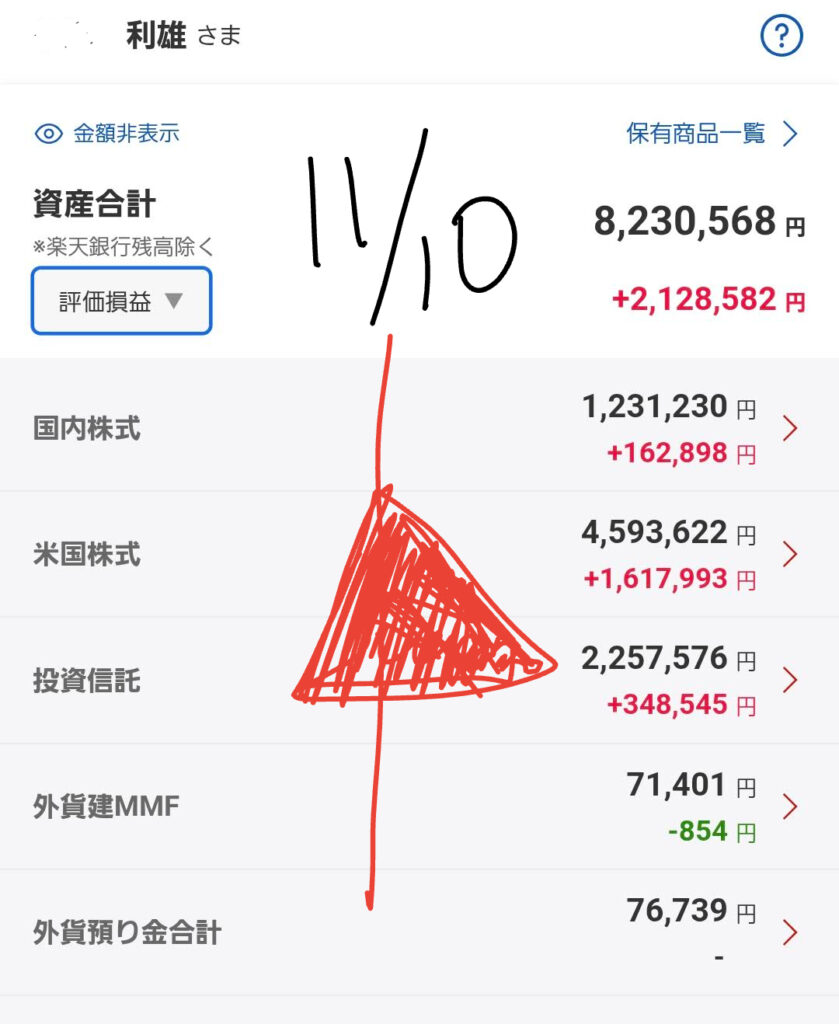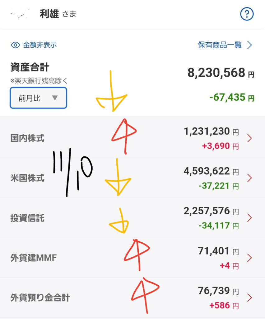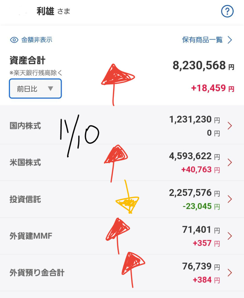 本日(11月10日)の資産状況と、昨日の市場の動きを受けての前日比を詳しく見ていきましょう。