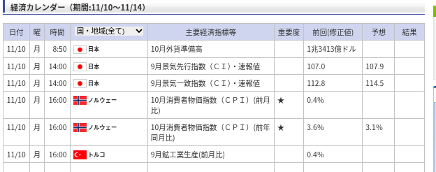 | 11/09 (日) | 10月消費者物価指数 (C P I) (前年同月比) | -0.3% | 0.0% | 0.2% | ⬆️ | デフレ懸念が和らぐ結果。予想を上回り、プラス圏に浮上しました。景気回復の兆しとしてポジティブに捉えられます。 |