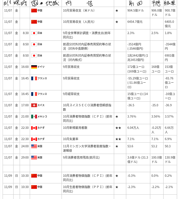 | 11/07 (金) | 10月貿易収支 (米ドル) | 904.5億ドル | 906.0億ドル | 900.7億ドル | やや⬇️ | 予想を下回る黒字額に縮小。特に輸出が市場予想を下回る伸び率となり、世界的な需要の減速が示唆されます。人民元建てでも同様に黒字が縮小しました。 |