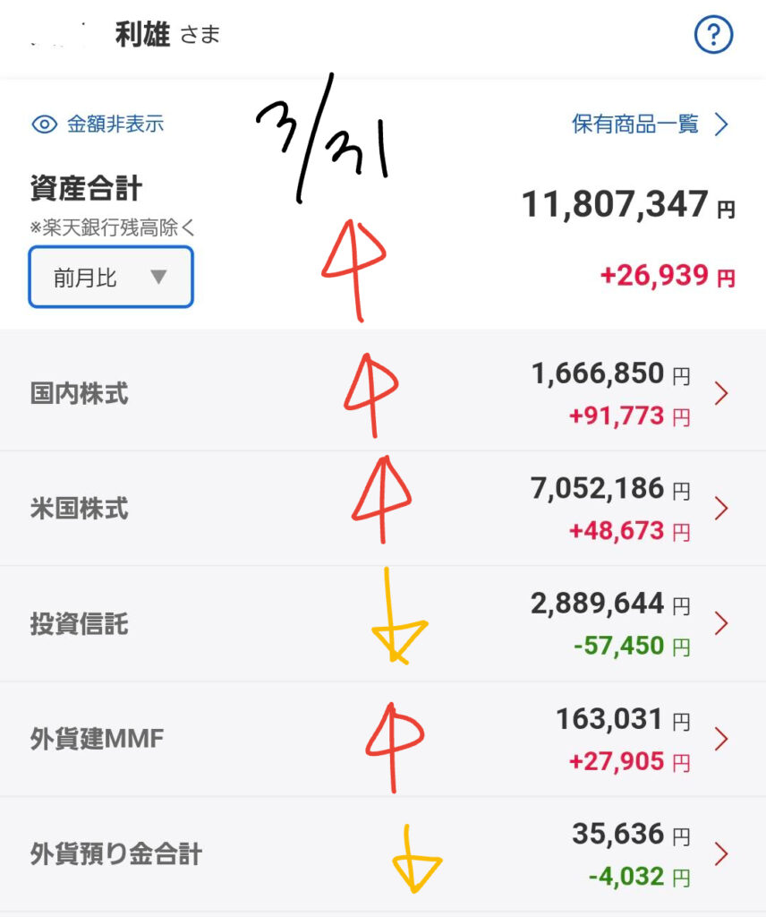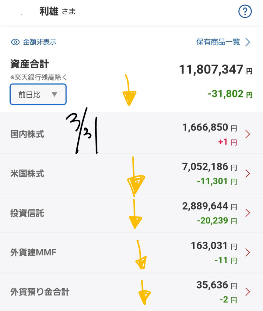 | 楽天証券(主力) | ⬇️ -31,802 円 | 米国株・投信の下落が直撃 |