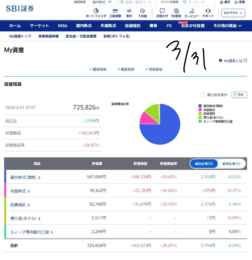 | SBI証券 | ⬇️ -3,994 円 | 国内現物株の軟調 |