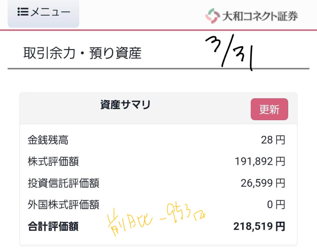 投資信託が ⬇️ 20,239円 と大きく削られたのが痛手ですが、これこそが今の市場のボラティリティを物語っています。
