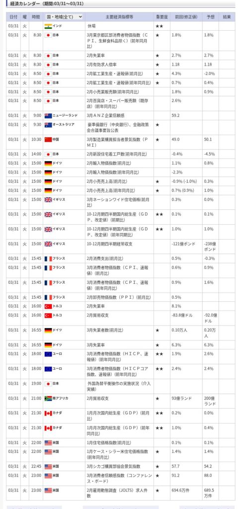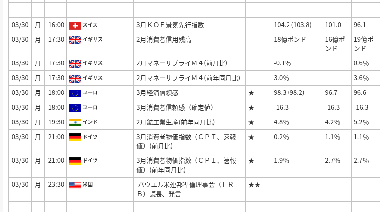 3月30日の経済指標を俯瞰すると、**「欧州のインフレ鈍化」と「米国の不透明感」**が対照的な動きを見せました。ドイツのCPIが予想外に低かったことは本来ポジティブですが、深夜のパウエル議長発言により、市場の関心は「インフレ再燃リスク」と「地政学リスク」へと一気にシフトしました。この結果、翌31日の東京市場や仮想通貨市場でのリスクオフ(極端な恐怖)に繋がる土壌が作られたと言えます。