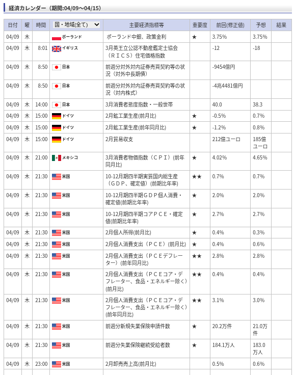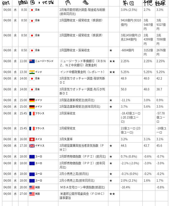 - 2月毎月勤労統計調査(現金給与総額): 3.3% ⬆️ 予想(2.7%)および前回(3.0%)を上回りました。賃金上昇の勢いが継続しており、インフレ局面における消費の支えとして注目されます。