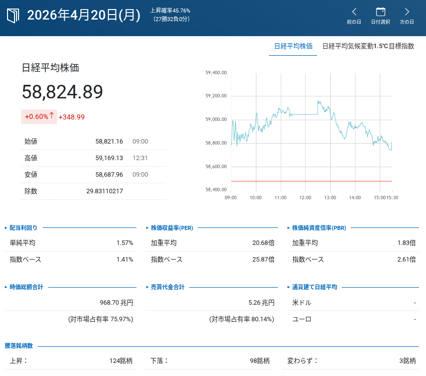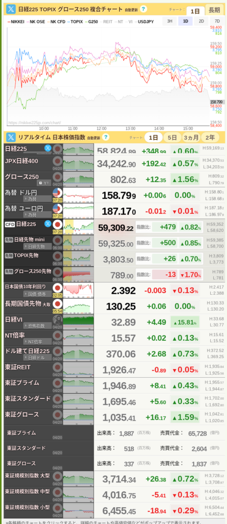 - 日経平均(現物): 58,824.89 円(前日比 ⬆️ +0.60% ) ※注:現物市場は前営業日(4/20)の終値です。