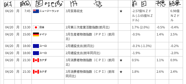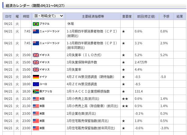 - 米国市場:3月小売売上高(21日夜発表)今夜の数字次第で、FRBの利下げシナリオが書き換わります。強ければドル高、弱ければ景気後退懸念と、どちらに転んでも相場が大きく放たれる可能性があります。