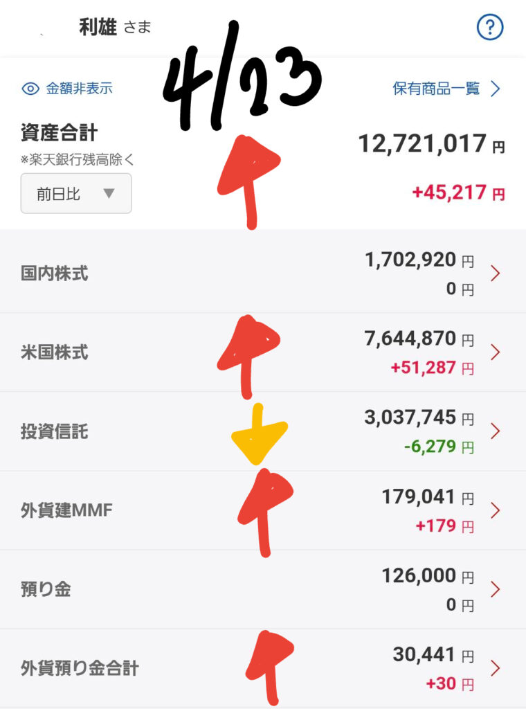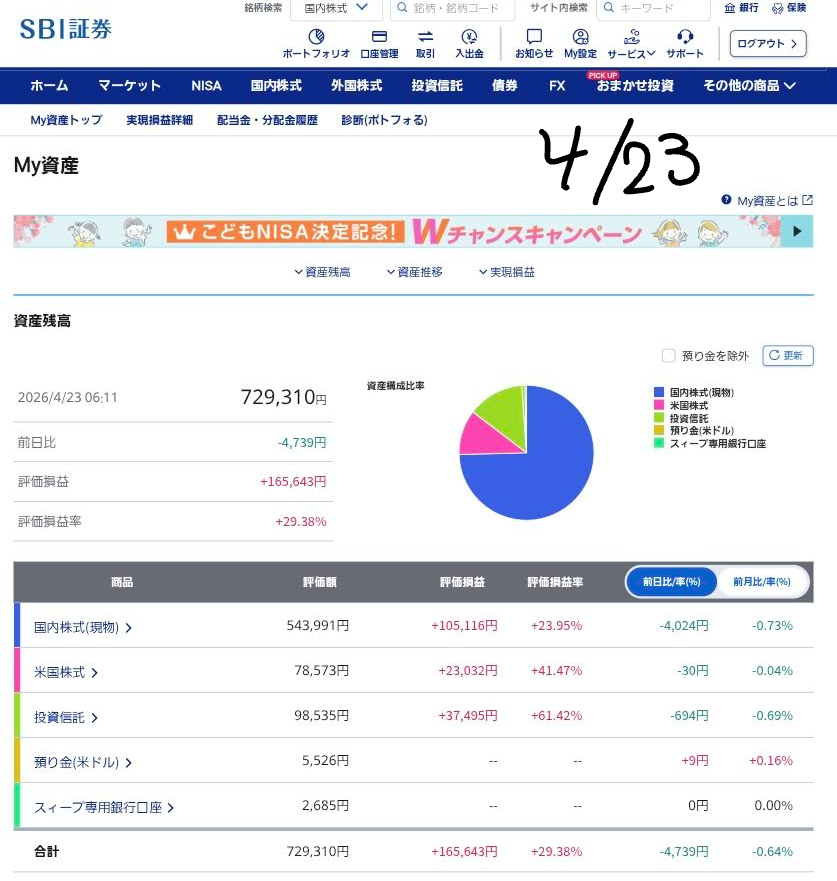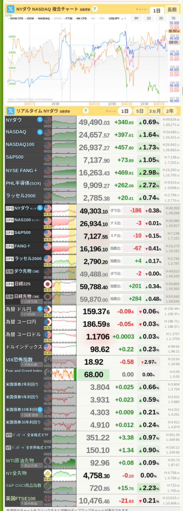 私の運用状況を見に来てくださり、ありがとうございます。4月22日から23日にかけての市場は、まさに「嵐の前の静けさ」から「激動の局面」へと移り変わるような動きを見せました。日米ともに企業の決算発表が本格化し、好悪材料が入り混じる中で、私のポートフォリオでも非常に大きな変化が起きています。2026年4月23日現在のリアルな数字に基づき、今、マーケットで何が起きているのかを解説します。