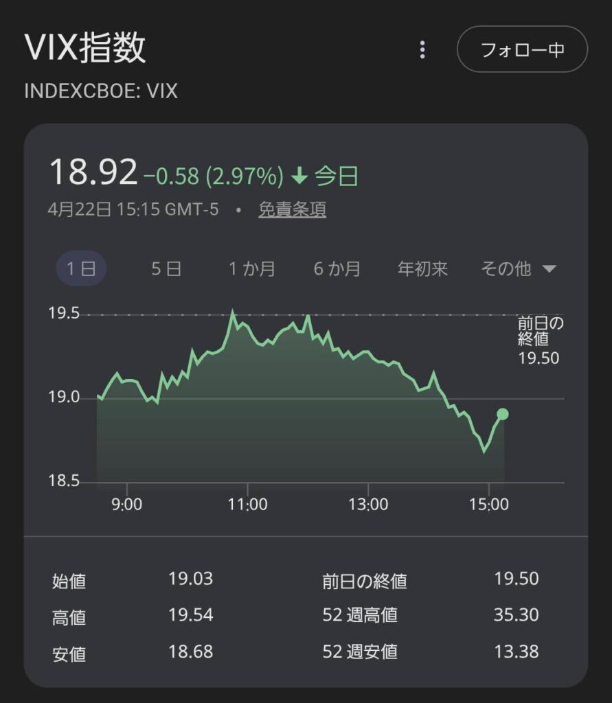 ・indexcboe: VIX指数: 19.30(前日比: ⬇️ -4.93%)