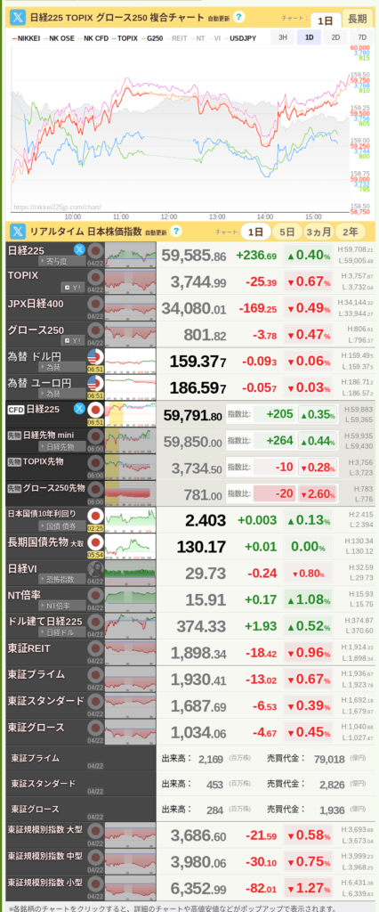 | ドル円為替 | 159.208 円 | ➡︎ 膠着 | 160円目前で当局の介入を警戒しつつも、円安トレンドは継続。 |