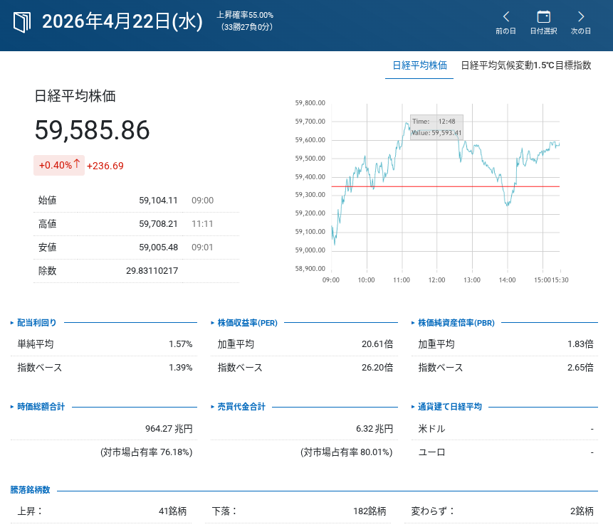 ・日経騰落銘柄数:(上昇:41 ⬇️ / 下落:182 ⬆️ / 変わらず:3 ⬆️)