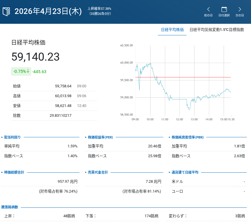 ・日経平均(現物): 59,140.23 円(前日比 ⬇️)