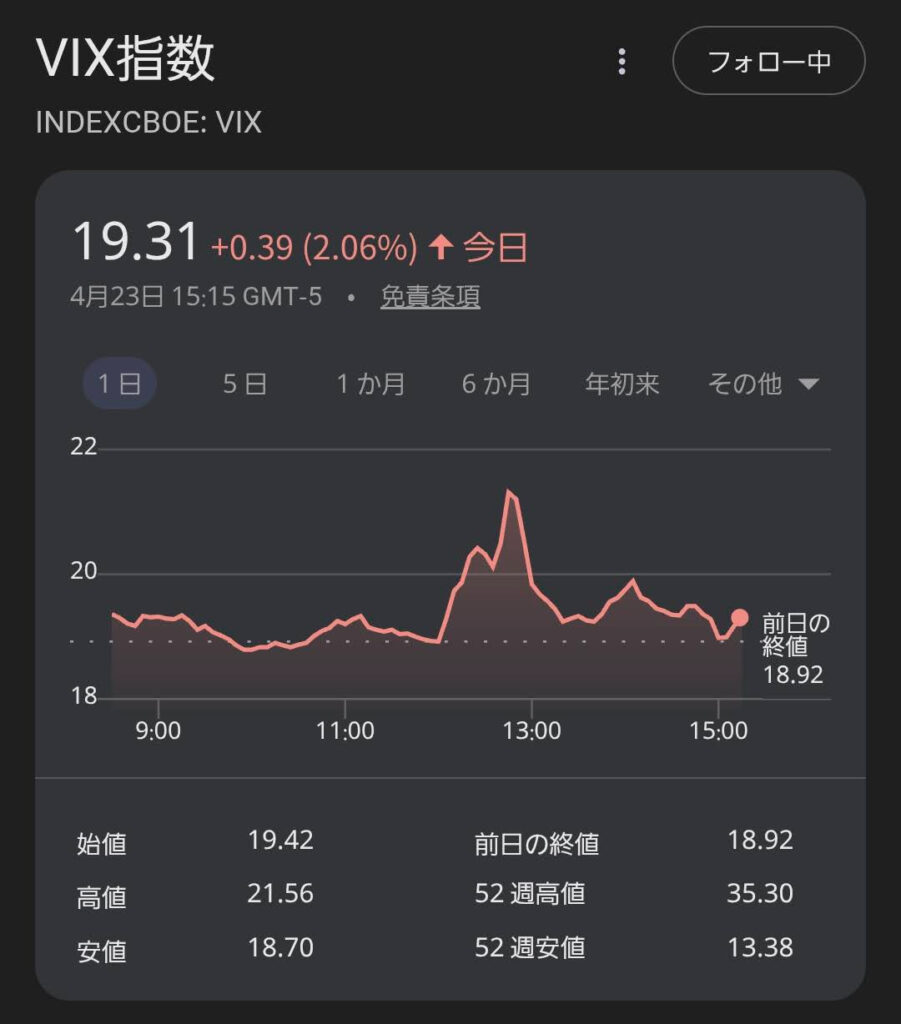 | VIX(米恐怖指数) | 19.30 | ➡︎ 警戒継続 | 米国でも不透明感が強く、下値への警戒が続いています。 |