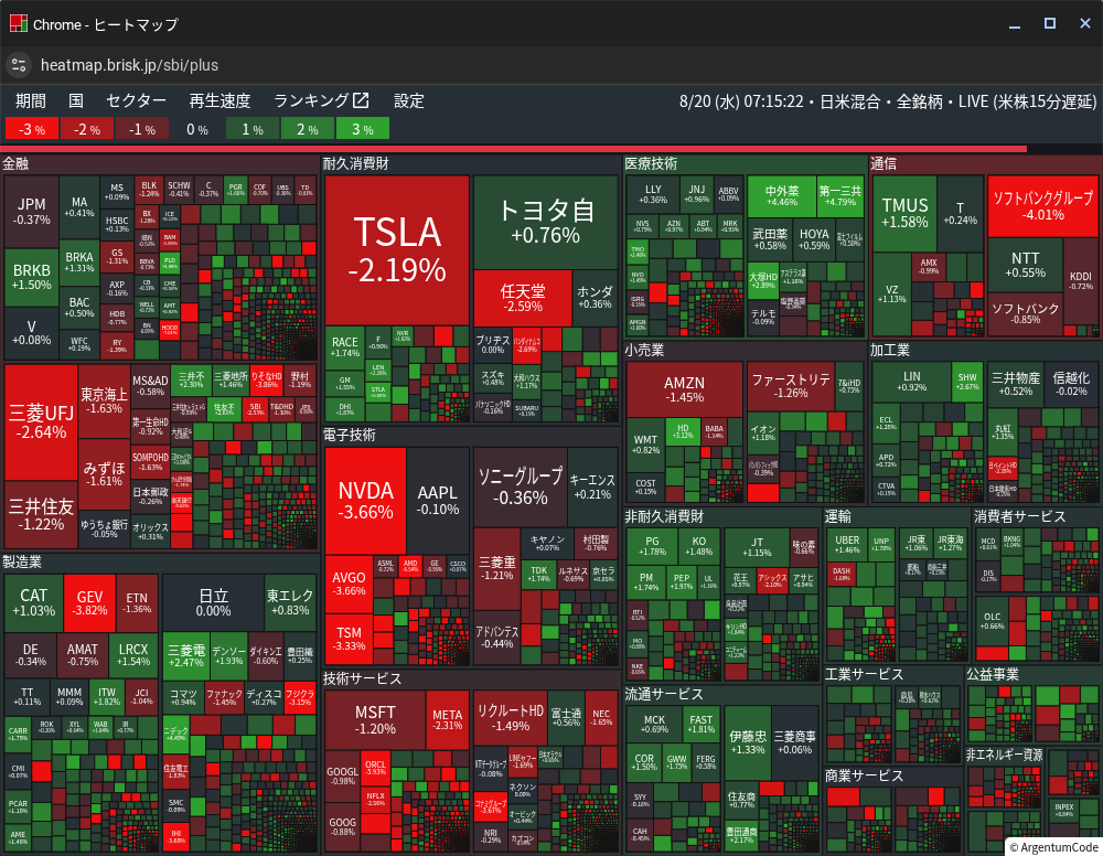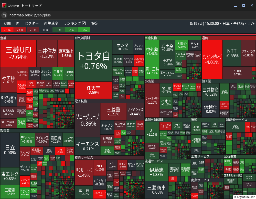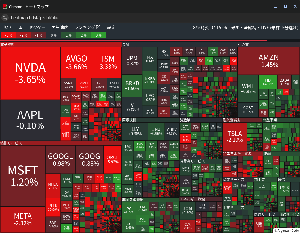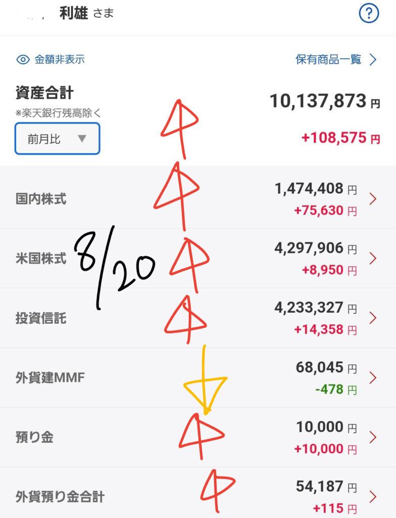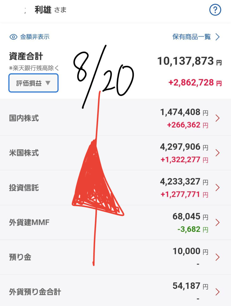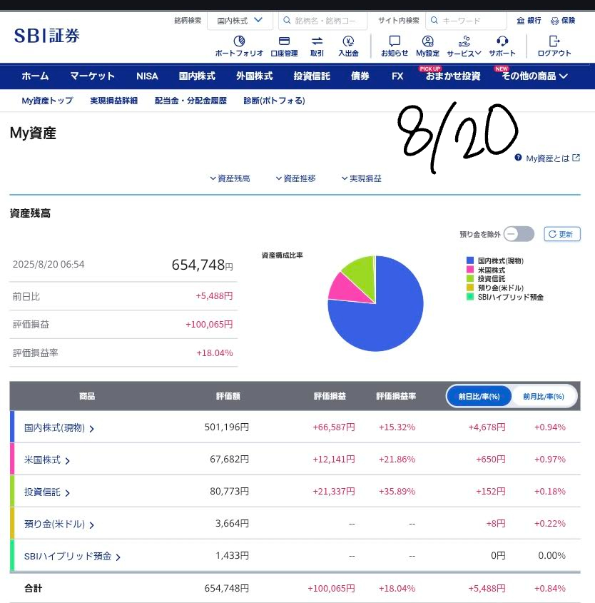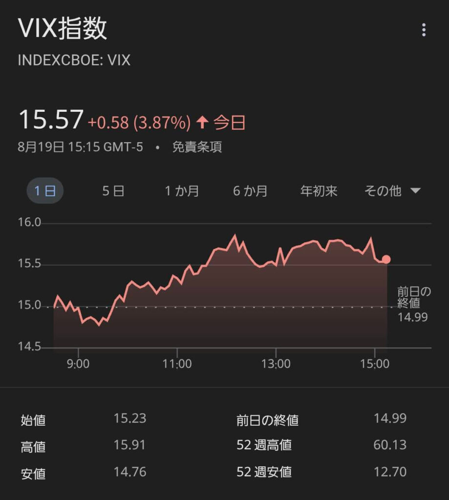 8月20日現在の資産状況としては、微増となってます。増えているだけで御の字です。数日の上げ相場の勢いが減速したのは昨晩の米国市場がやや不安定だったことが影響しているかもしれません。ただ、VIX指数(恐怖指数)は15.57と少し上昇していますが、まだ低い水準にあるので、大きな不安材料ではありません。国内株や投資信託が頑張ってくれたおかげで、米国株の小さな下落をカバーすることができました。