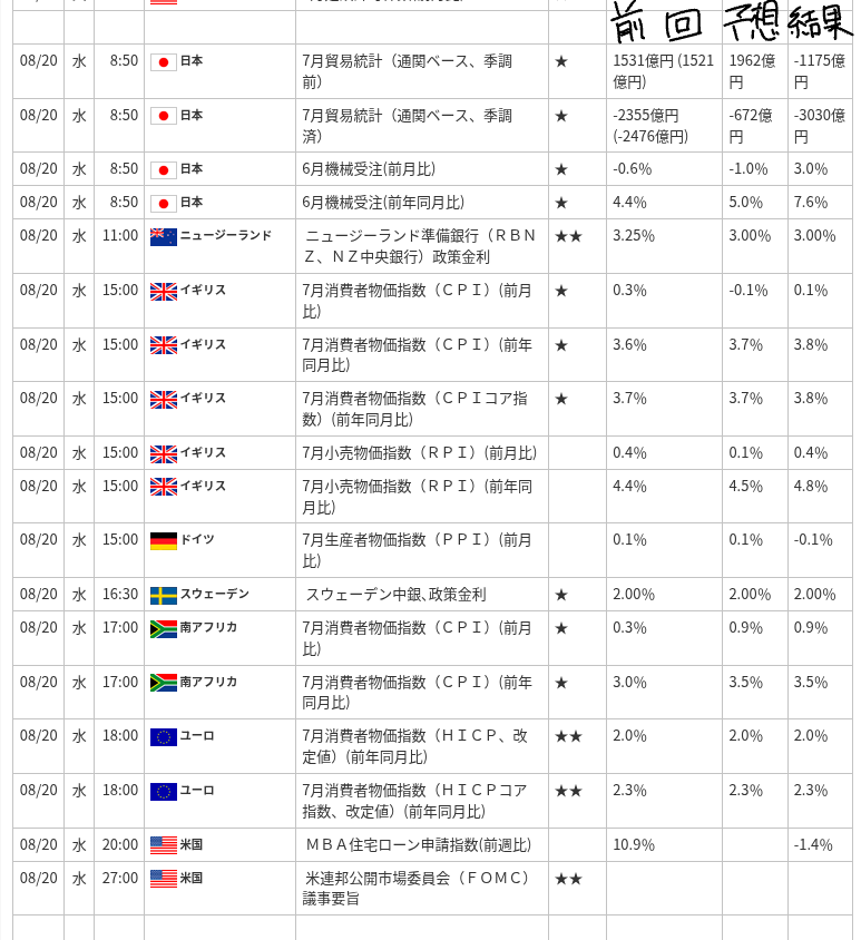 この画像は、2025年8月20日の各国の経済指標の結果を示したものです。以下に国ごとに詳細をまとめました。