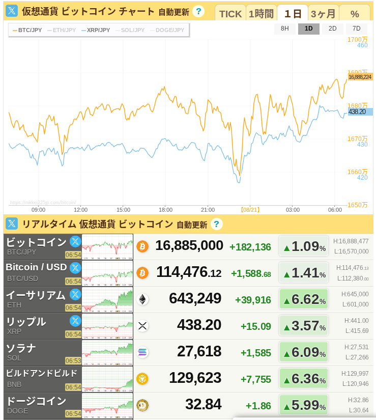 最後に、 仮想通貨にも少し触れておきましょう。ビットコインは現在1,688万5,000円と、順調に価格を上げています。他の仮想通貨も軒並みプラスになっており、全体的に好調なようです。