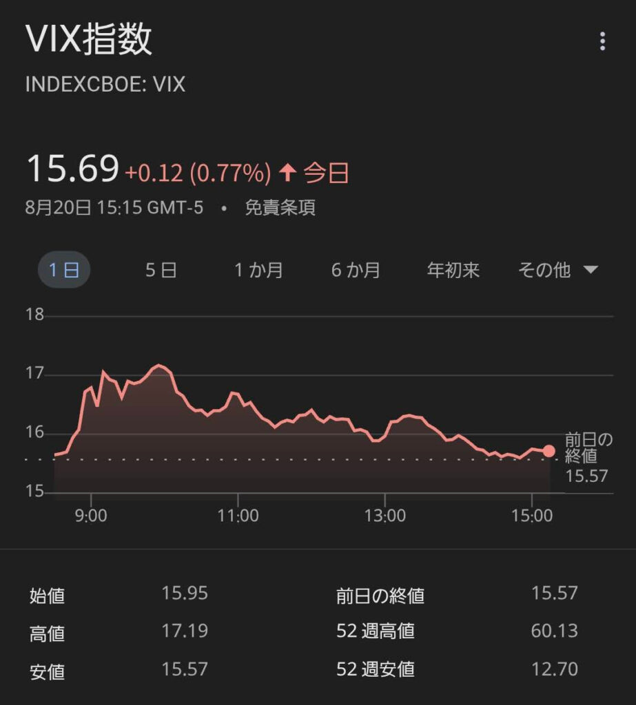 ただ、アメリカの恐怖指数「VIX」は15.69と、そこまで大きな変動はありません。市場のボラティリティ(変動率)は比較的落ち着いている状況です。