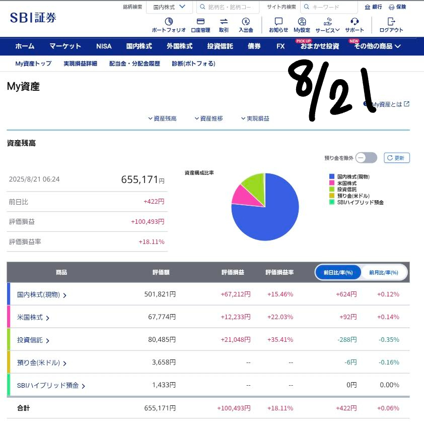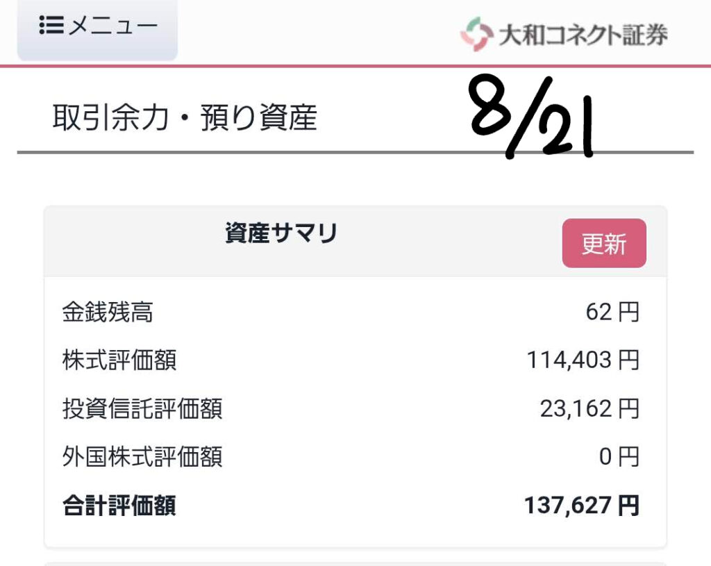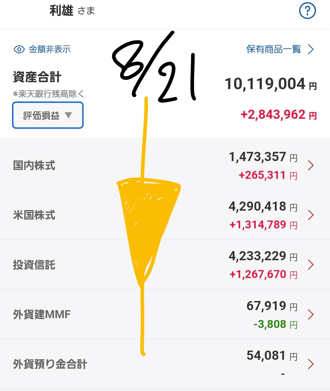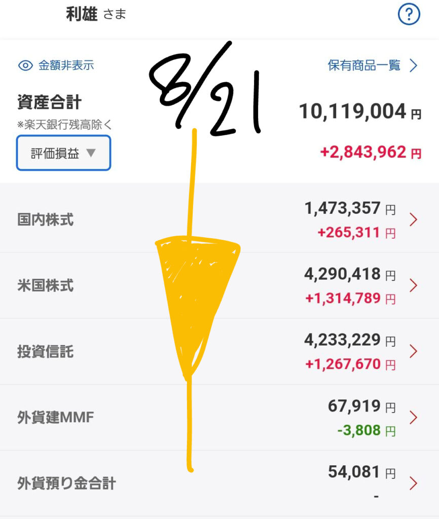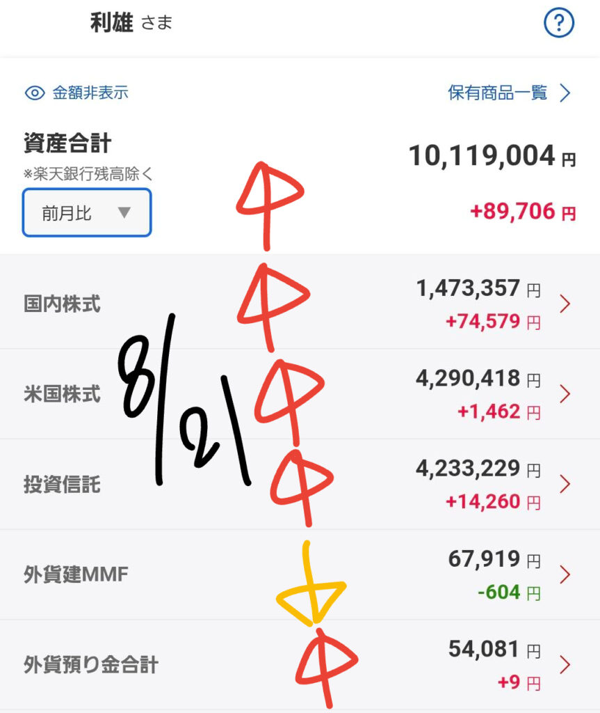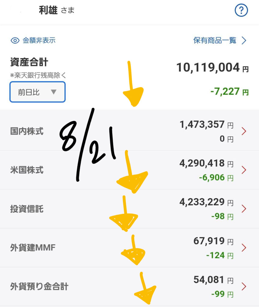 これは、国内株式は変わらずでしたが、米国株式と投資信託、そして外貨建MMFが少しずつマイナスになったためです。
