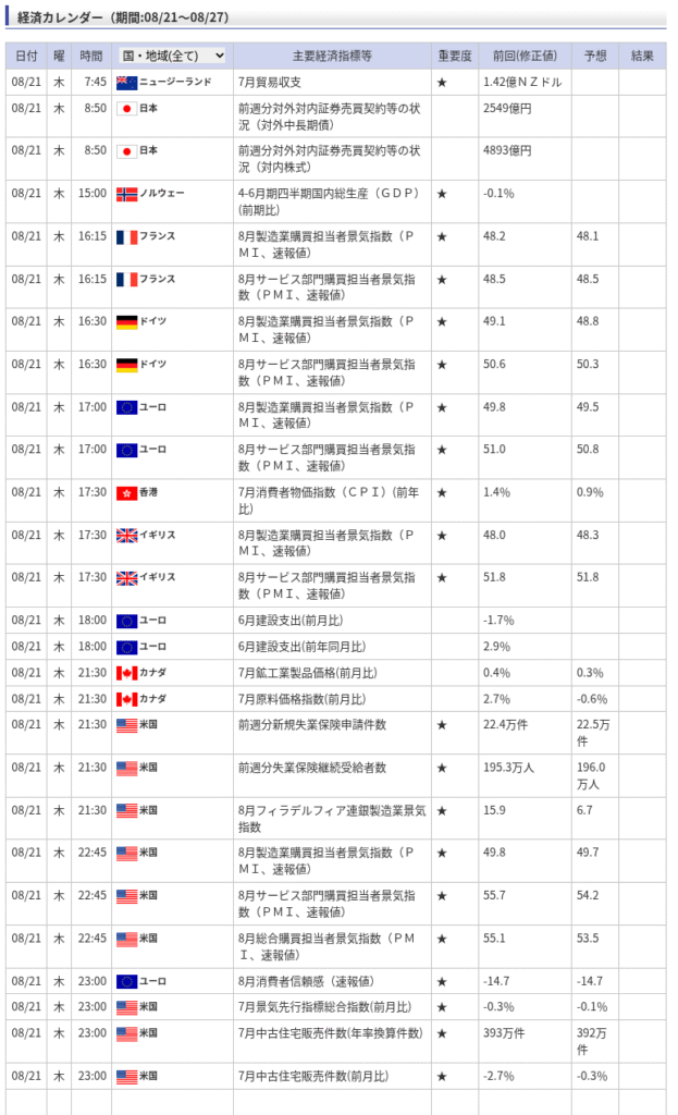 - 経済指標: 今日は、フランス、ドイツ、ユーロ圏、イギリス、アメリカで8月のPMI(購買担当者景気指数)の発表があります。これらは今後の景気動向を占う上で非常に重要な指標です。特に、製造業とサービス業の両方に注目しましょう。