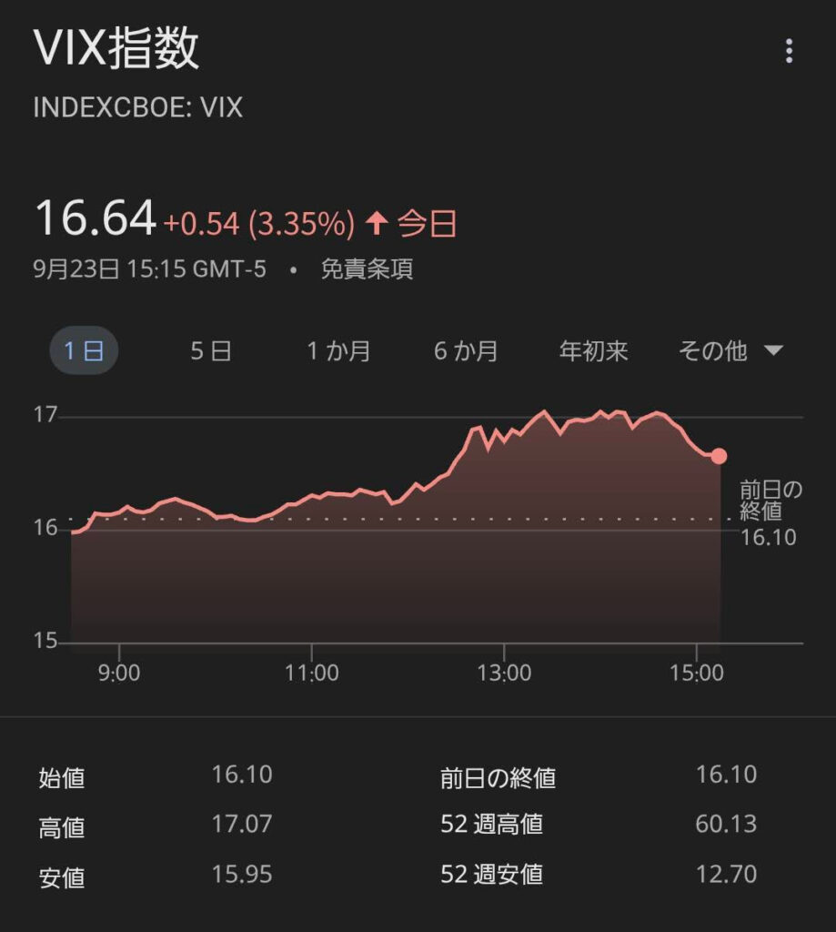 もう一つ注目すべき点として、VIX指数(恐怖指数)があります。昨日はわずかに上昇しましたが、16.64とまだ低い水準で推移しています。これは、「市場の投資家は、今のところ大きな変動やリスクをそれほど懸念していない」ということを示しています。