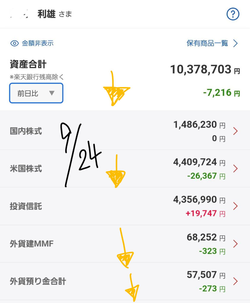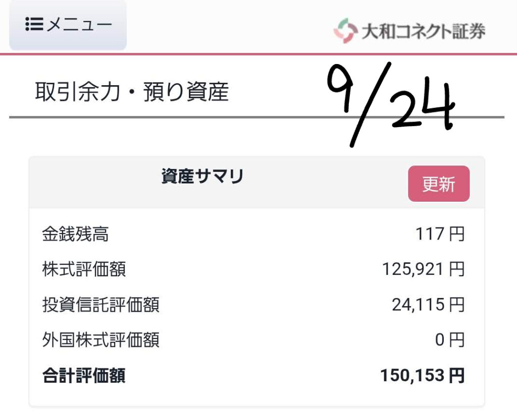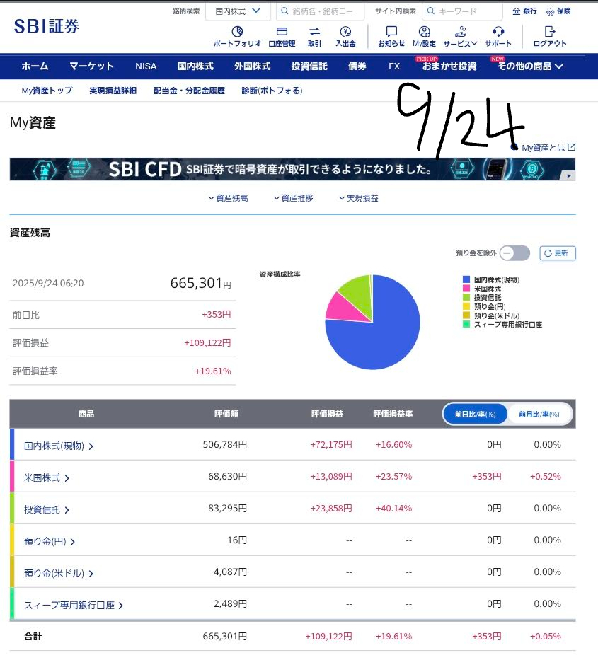 9月24日(水)の僕のポートフォリオを公開します。昨日の市場の動きを踏まえ、現在の状況と今後の見通しについて、皆さんと一緒に見ていきましょう。