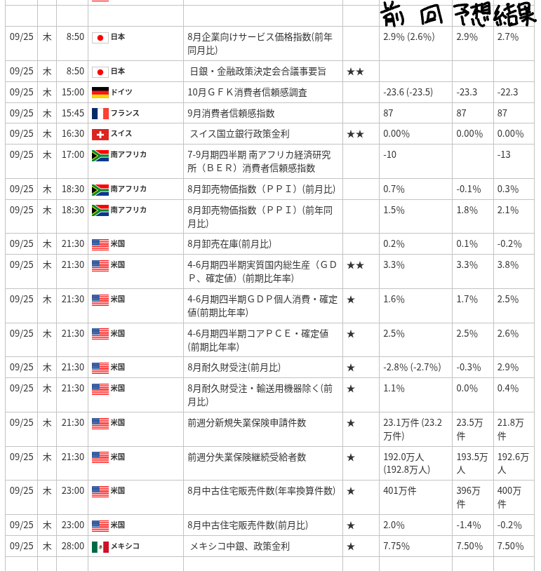 今回の経済指標を全体的に見ると、米国が突出して強い結果を出した一日でした。GDP、個人消費、耐久財受注、雇用など、主要な指標が軒並み予想を上回り、経済の堅調さが再確認されました。これは、FRBが急いで利下げを行う必要がないことを示唆し、市場の利下げ観測を後退させる可能性があります。