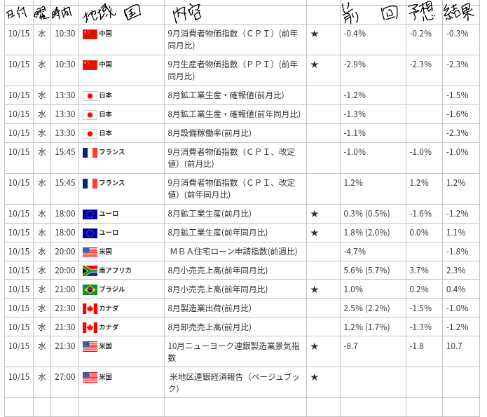 昨日の資産動向を理解するために、10月15日に発表された主要な経済指標と、市場全体の動きを確認しましょう。