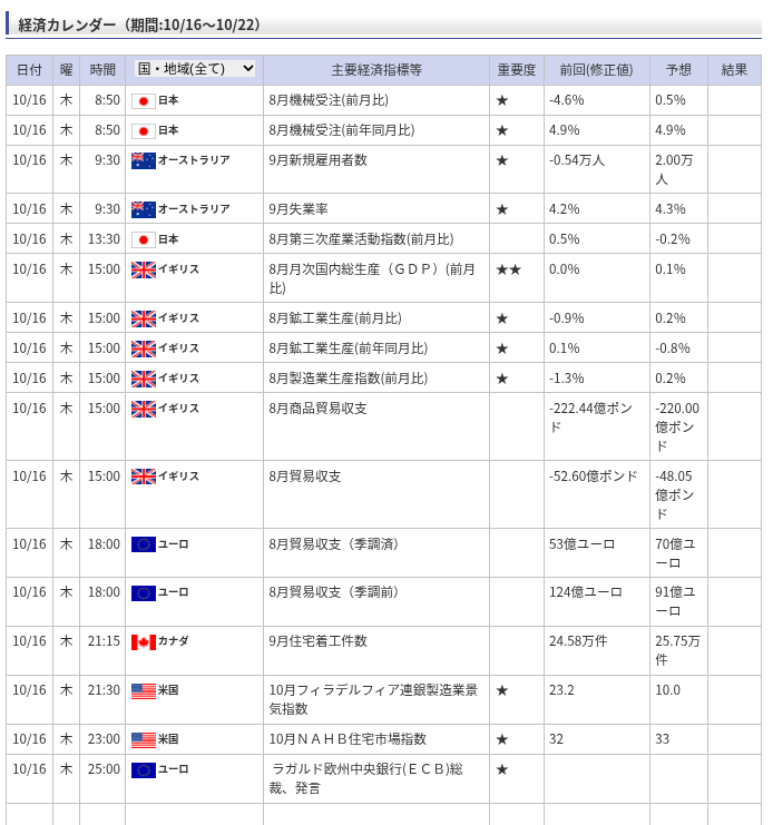 2025年10月15日の経済指標の結果は、米国製造業の予想外の強さと、アジア・欧州・カナダの景気減速・停滞の兆候が混在する内容となりました。