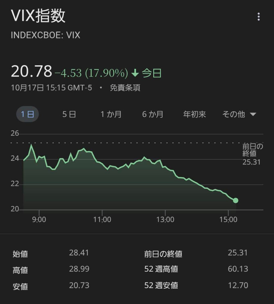 • VIX指数(恐怖指数)は直近で20.78まで急落しており、市場の警戒感は和らいでいますが、これは一時的なものかもしれません。