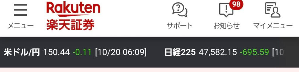 まずはメインの楽天証券の状況から、前日比をメインにチェックします。