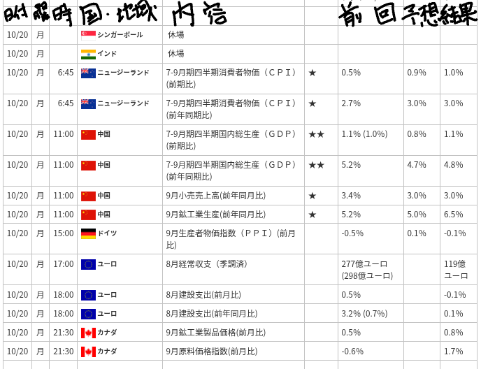 10月20日(月)に発表された主要経済指標では、中国とニュージーランドの結果が特に目立ちました。