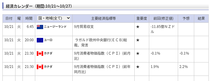 21:30 | カナダ | 9月消費者物価指数(CPI) (前年同月比) | ★ | 1.9% | 2.2% | カナダ中銀の金融政策に直結する最重要指標です。予想通り加速すれば、カナダドル高の要因となります。 |