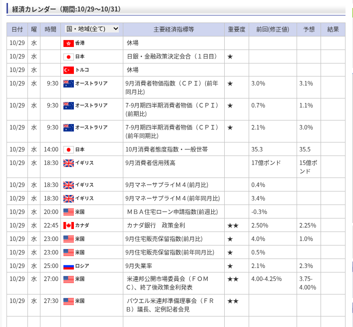 本日10月29日(水)は、金融市場にとって非常に重要なイベントが控えています。