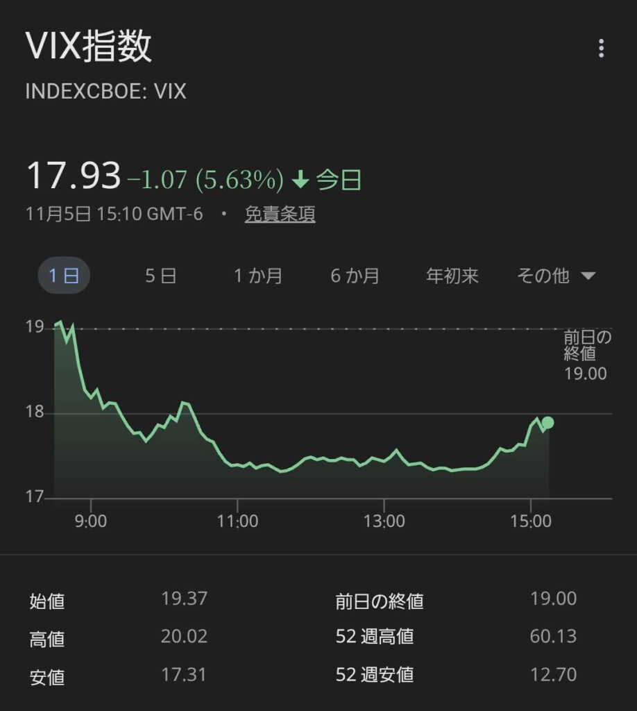 昨晩のVIX指数は17.93で引け、前日の終値(19.00)から5.63%の大幅下落 ⬇️となりました。