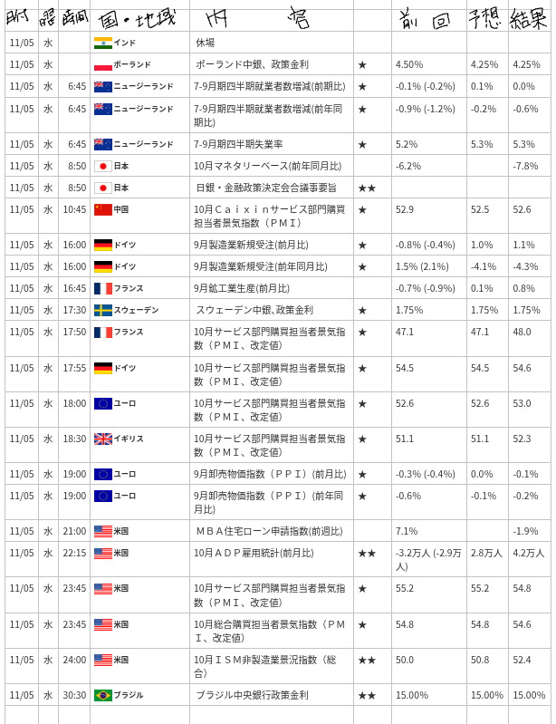 11月5日の経済指標は、先進国のサービス部門の堅調さと、米国の雇用統計の強さが目立つ一方、一部で製造業や物価の減速が見られるなど、好悪入り混じる結果となりました。