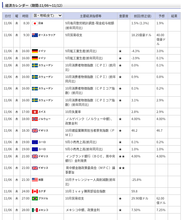 - 11月6日 21:00 🇬🇧 イギリス:イングランド銀行(BOE)政策金利発表 (★★)
