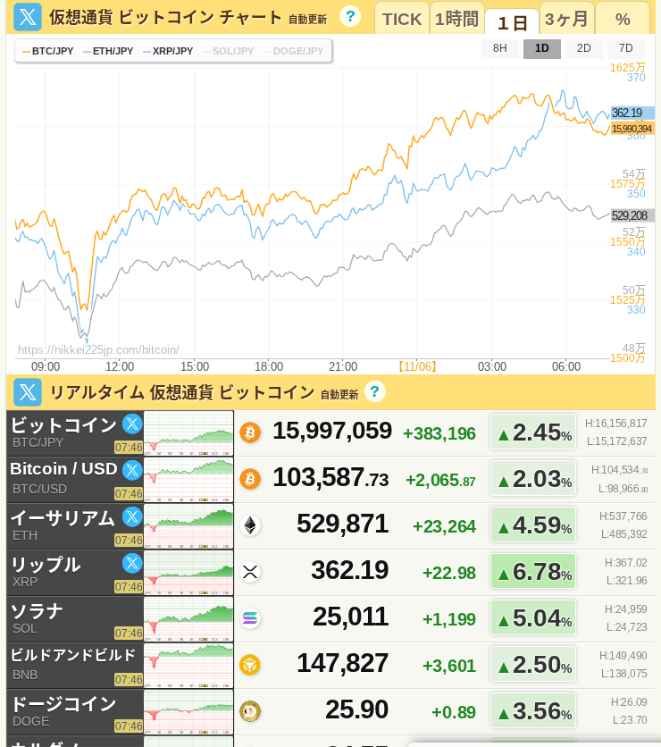 - ビットコインは、11月6日時点で1,599万円台と前日比**+2.45% ⬆️**の大幅高となり、史上最高値圏での推移を続けています。