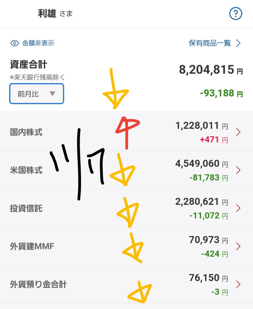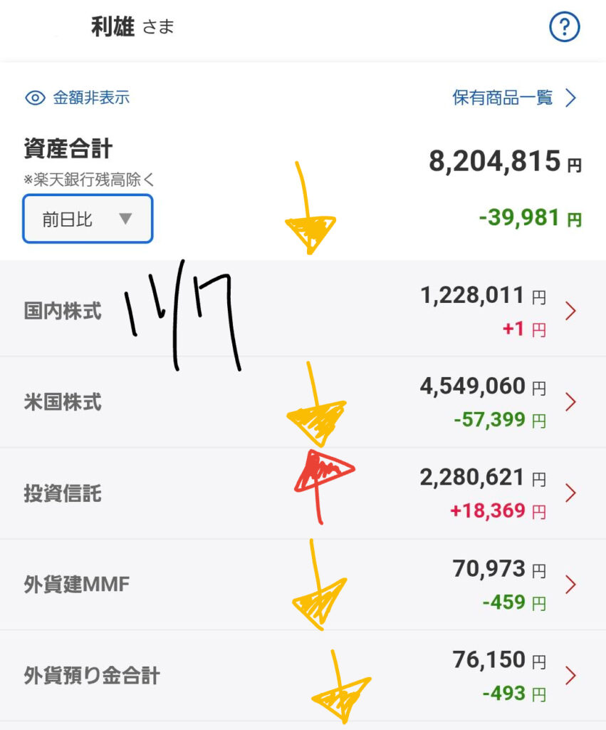 昨日の市場の動きを受け、私の資産は全体的に減少しました。