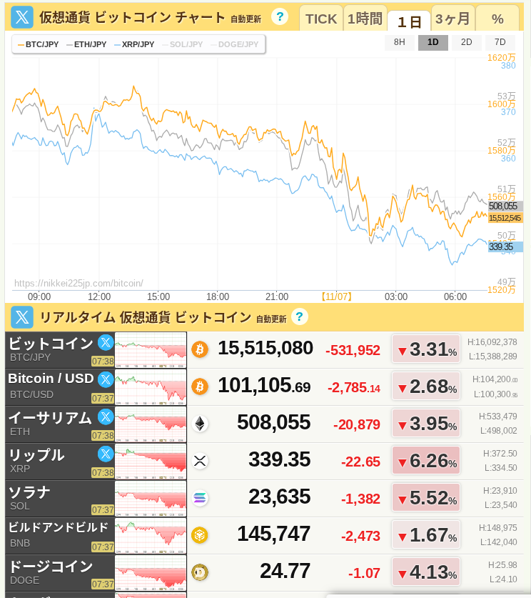 - ビットコイン(BTC/JPY)は 15,515,080円、前日比 -3.31% ⬇️と大きく下落しています。