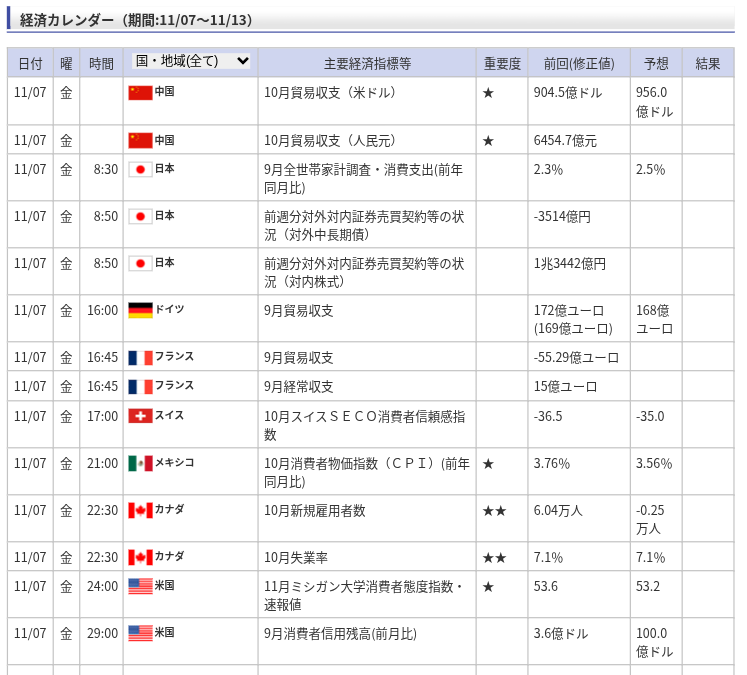 | 22:30 | 🇨🇦 カナダ | 10月新規雇用者数 / 10月失業率 | ★★ |