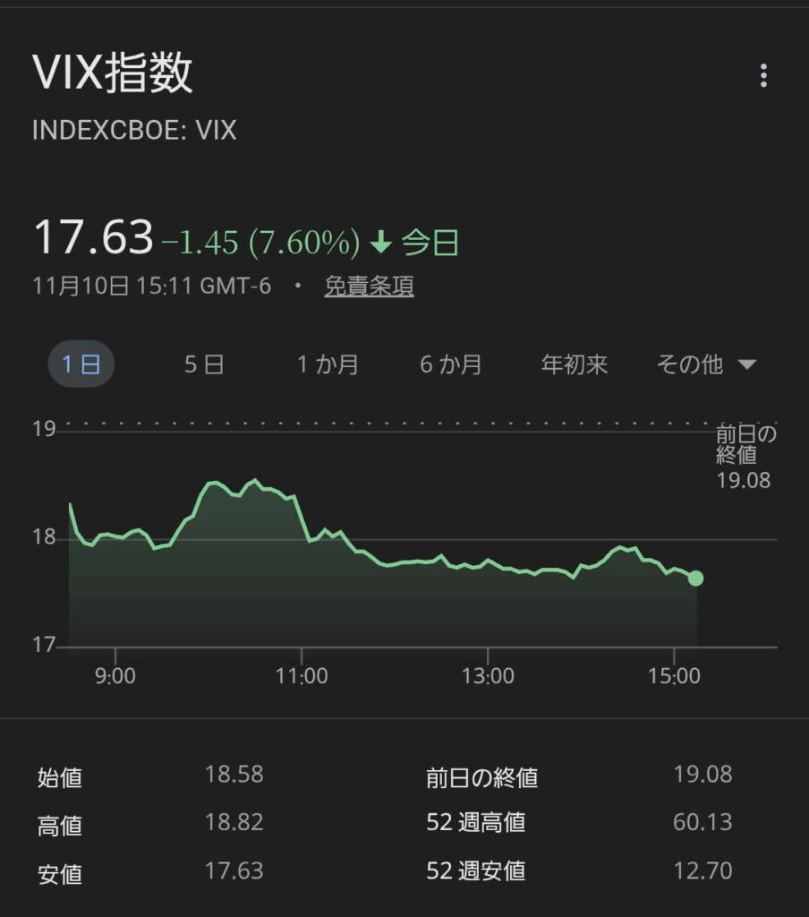 昨日の米国市場の動向を見る上で重要なのが、**VIX指数(恐怖指数)**です。