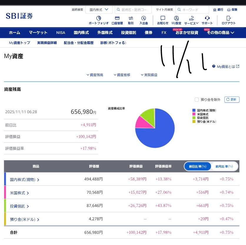 SBI証券の口座も、前日比で約5,000円のプラスとなっており、全ての資産クラスで堅調に推移しています。