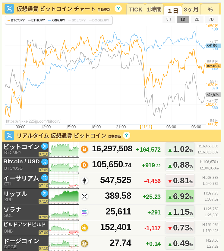 ビットコイン (BTC/JPY)16,297,508円+164,572円+1.02%上昇 ⬆️