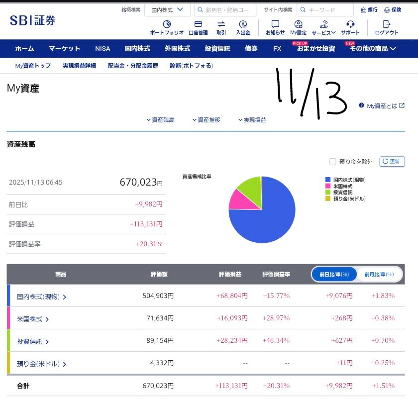 したがって、純粋な株価変動による資産増加は、差し引きすると約+25,000円ほど。昨日の市場の上昇と円安の恩恵を受け、堅実に資産が増加した一日でした。資金を遊ばせず、しっかりと投資へ資金を回しております。