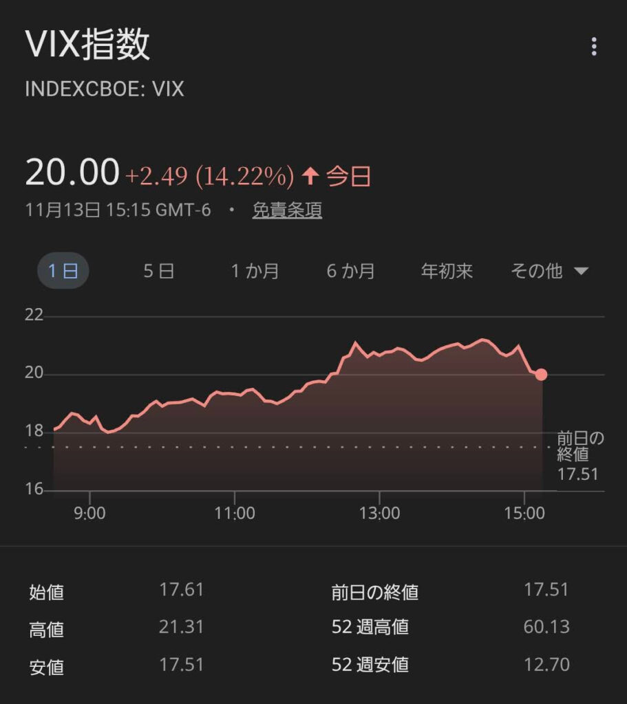 - 米国株式: -74,020円と、マイナスの大部分を占めています。これは、昨夜の米国市場(前日11/13)が、特定の要因(後述のVIX指数や市場の反応)により、利益確定売りなどで下落したことが直接影響しています。