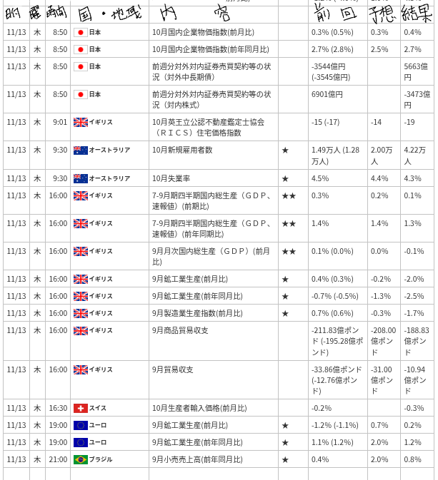 11月13日の主要経済指標は、オーストラリアの雇用市場の強さが突出した一方で、イギリス経済の減速懸念が鮮明になった一日でした。