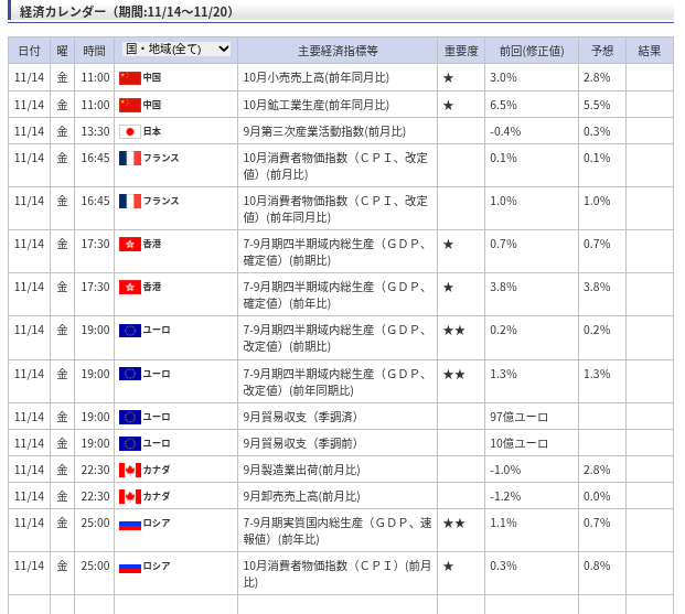 | 11:00 | 🇨🇳 中国 | 10月鉱工業生産(前年同月比) | 5.5% | 世界の景気を占う指標。予想(5.5%)を上回るか否かが焦点です。 |