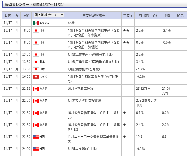 本日、11月17日は週明けですが、日本市場が開いていないため、国内市場の影響は出ていません。今日のポイントは「日本経済指標の悪化懸念」と「カナダのインフレ指標」です。