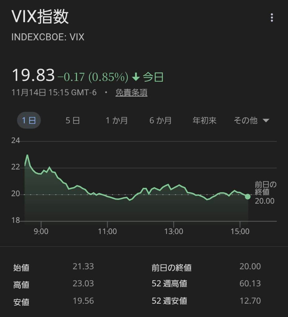 | VIX指数(11/14終値) | 19.83 | -0.17 (0.85%) | ⬇️ |