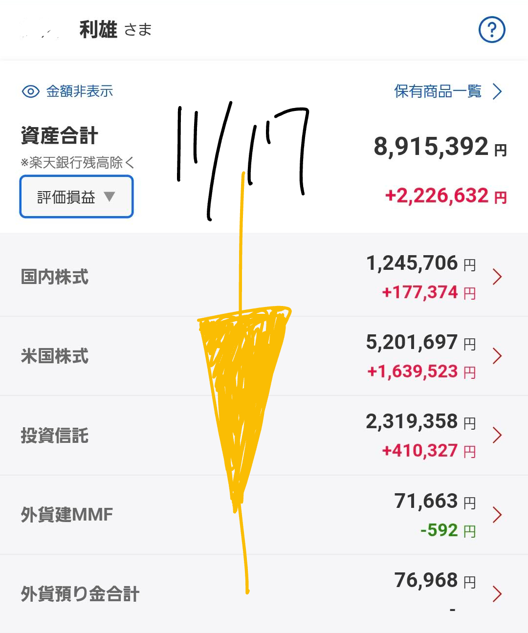 | 資産合計 | 8,915,392円 | -26,398円 | ⬇️ |