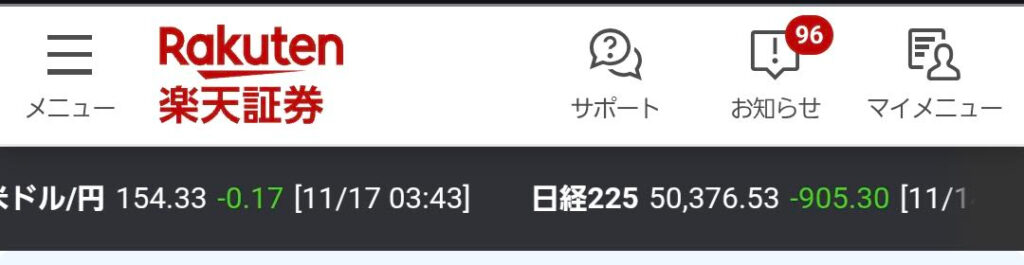7-9月期 四半期実質国内総生産 (GDP、年率換算)-1.8%前回(2.2%)より⬇️ 悪化予想の-2.4%よりは良かったものの、前回からマイナス成長に転じました。これは景気の勢いが失速していることを示し、日経平均株価が大きく下落する主因となりました。(楽天証券の画像からも日経225が**-905.30円**と大幅に下落していることが分かります)
